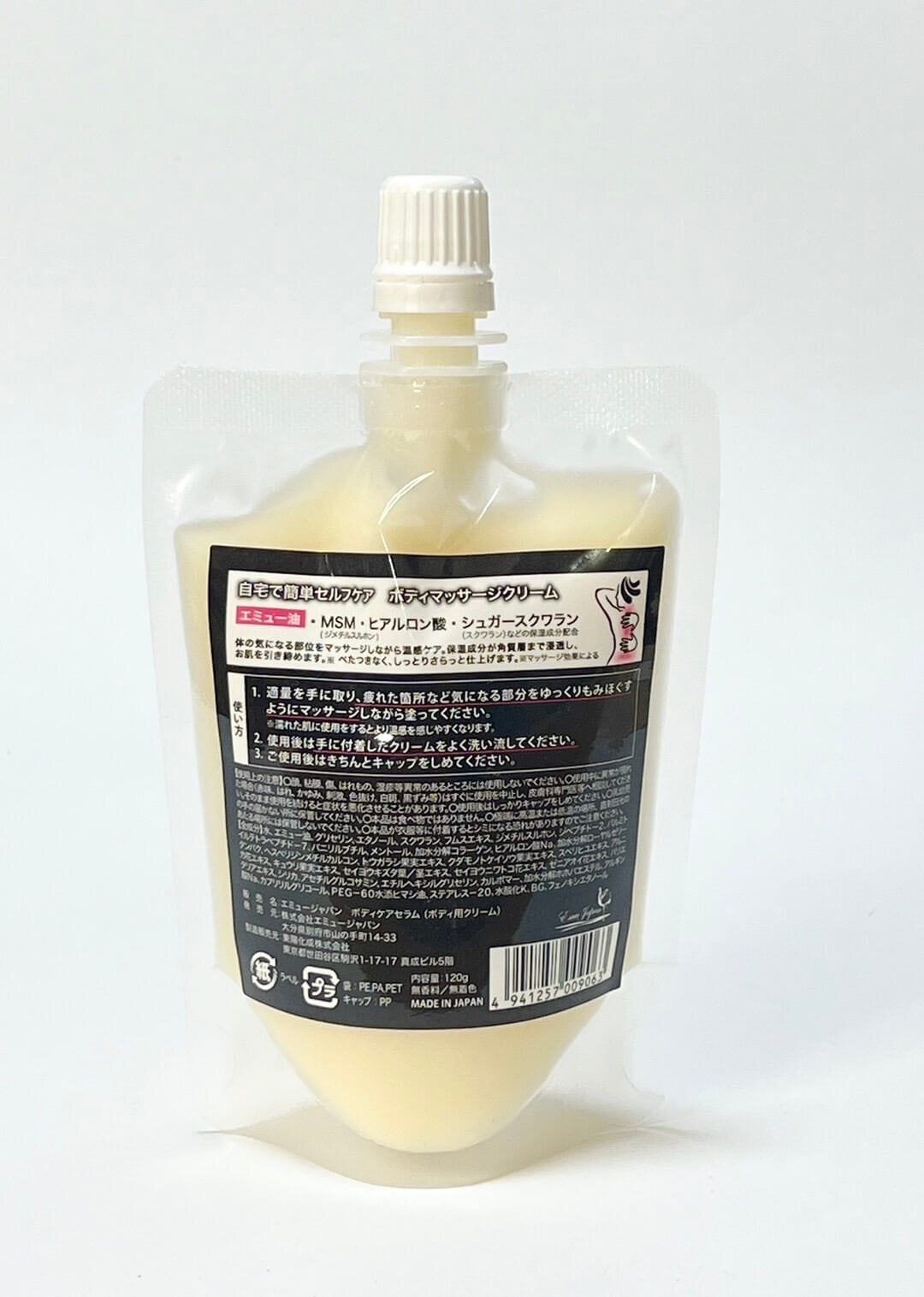 ボディクリームは、エミュー油を使用した贅沢なボディケアアイテムです。エミュー油は、その優れた保湿力で肌をしっかりとケアし、しっとりとした滑らかな肌へと導きます。体の期になる部位をマッサージしながら温感ケア。保湿成分が角質層まで浸透して肌を引き締め、べたつきなく、しっとりさらっと仕上げます。特に乾燥が気になる季節にぴったりなボディクリームです。コンパクトなパッケージデザインは、どの場所にもフィットし、使いやすさを追求しています。